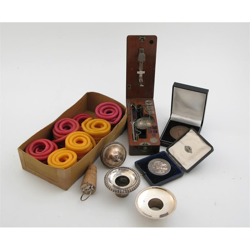 A quantity of spares, including wax jack coils, blue glass liners, plated and silver nozzles, a set of scales etc. (lot)