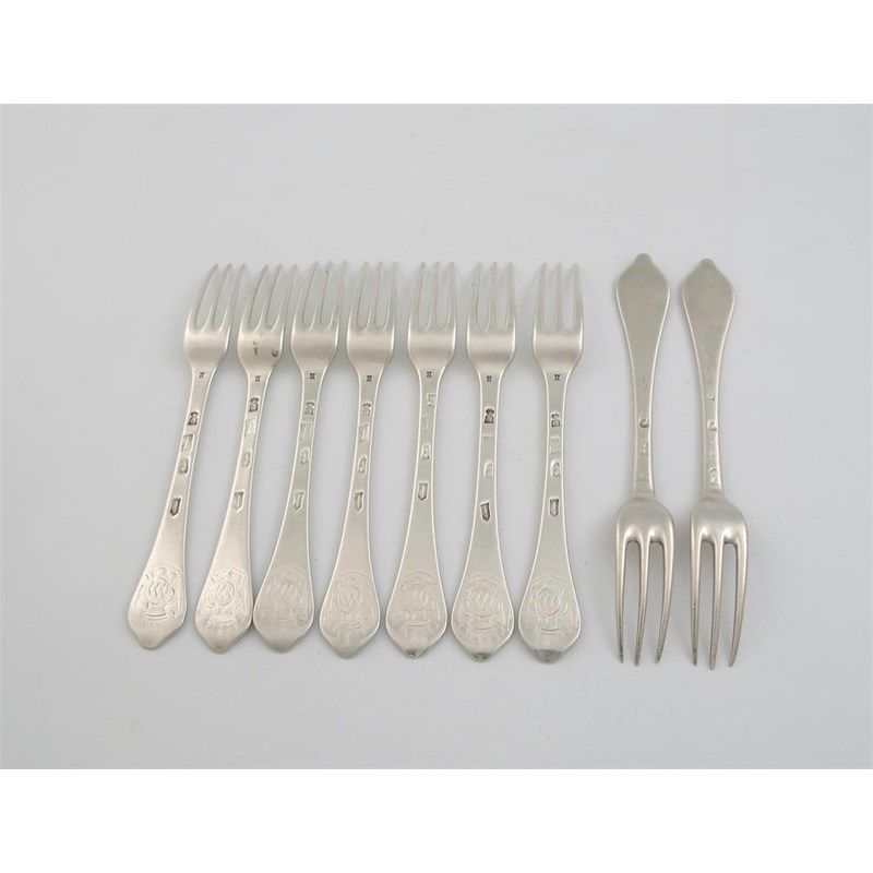 A set of seven William III dognose tableforks, three prong with an engraved coat of arms on the terminal and an incised initial 'H', above the tines, by William Lewis, London 1700 and a pair of dognose tableforks, crested, marks a little worn, London 1701, 17.5oz. (9)