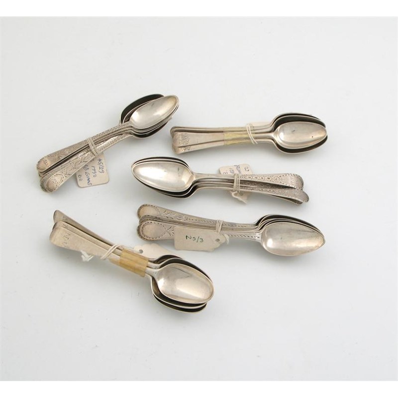 A set of 6 George II/III fancy back teaspoons, with rocaille fronts, initialled 'D', marks worn, c.1760, two sets of six George III feather edge teaspoons, a set of 6 fancy back teaspoons basket of flowers, c.1760 and a set of five Old English teaspoons, 14oz. (29)