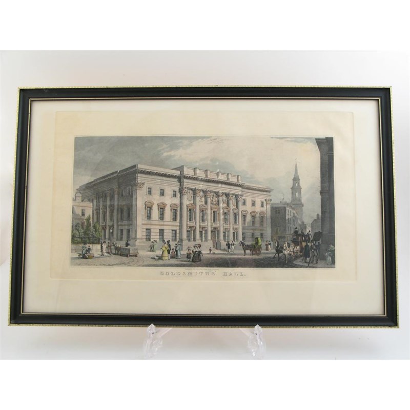 A framed and glazed coloured engraving, depicting a view of the Goldsmiths Hall (by J.Rogers, Funchley, from a drawing by Thomas H.Shepherd), 14.5in (37cm) x 23in (58.5cm).