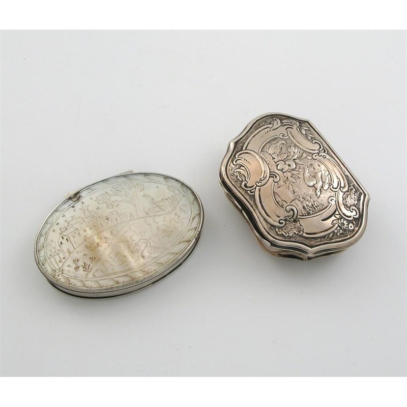 A George II cartouche shaped snuff box, chased on the cover with birds, flowers, husks and scrolls, gilt interior, by Robin Albin Cox, London 1750, and an early 18th century mother of pearl mounted oval snuff box, with an engraved scene on the cover, stand away hinge, unmarked 1720, 2.8in (7.1cm) wide, 1.75oz weighable silver. (2)