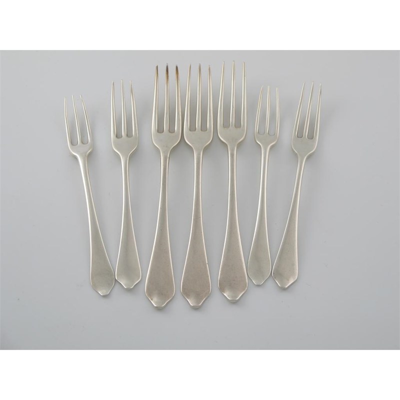 A pair of Queen Anne wavy end three prong dessert forks, crested, makers mark worn, London 1709 together with a set of three modern wavy end tableforks and two dessert forks (three prong), by William Comyns, London 1914, 12.25oz. (7)