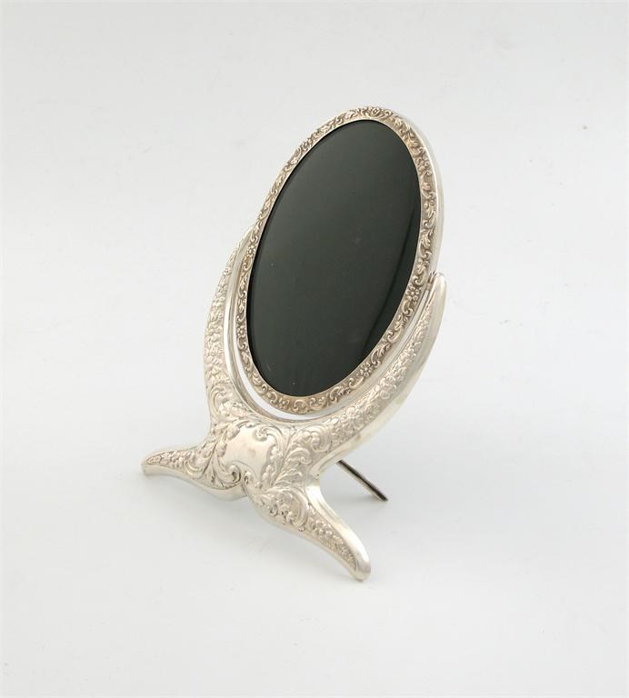 A late Victorian dressing table mirror, with embossed decoration, an easel stand and an oval glass window, mounted so that it swings, by A.J Smith, Chester 1900 (registered design number), 5.75in (14.5cm) high. (loaded).