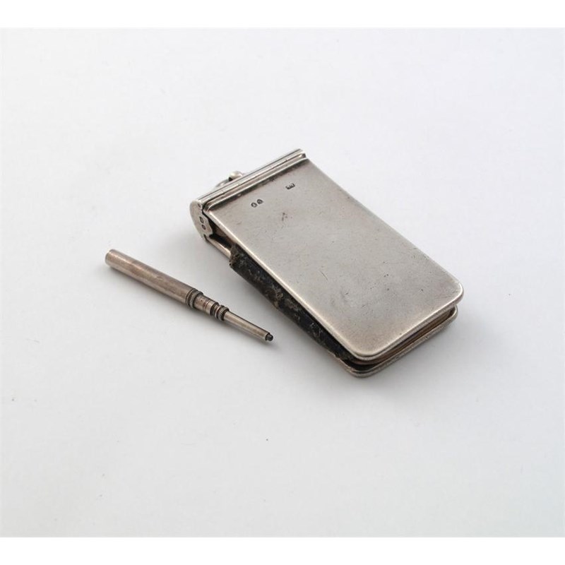 A Victorian mounted notepad, with 'sprung' covers and suspensory ring, complete with pencil, the paper with numerous scribbling's, by Louis Dee, London 1880, with retaillers mark of 'Jones 23 Bvd de capucines and 41st James's St, Paris and London, 2.75in (7.1cm) long.