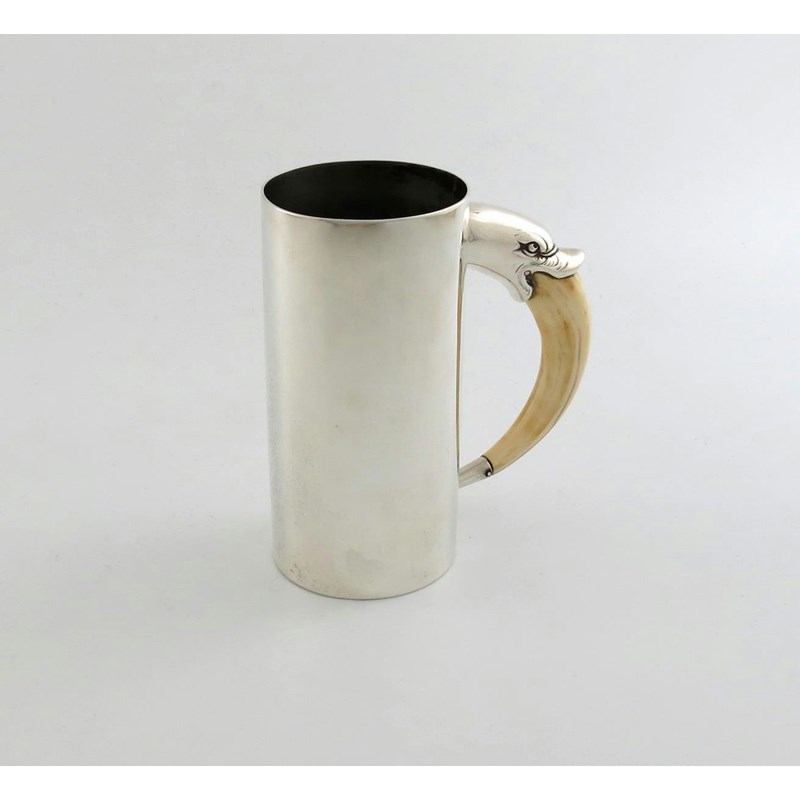 cylindrical form, the scroll handle formed by a boar tusk issuing from a mythical beast's mouth, height 16cm, approx. weight 12.5oz.