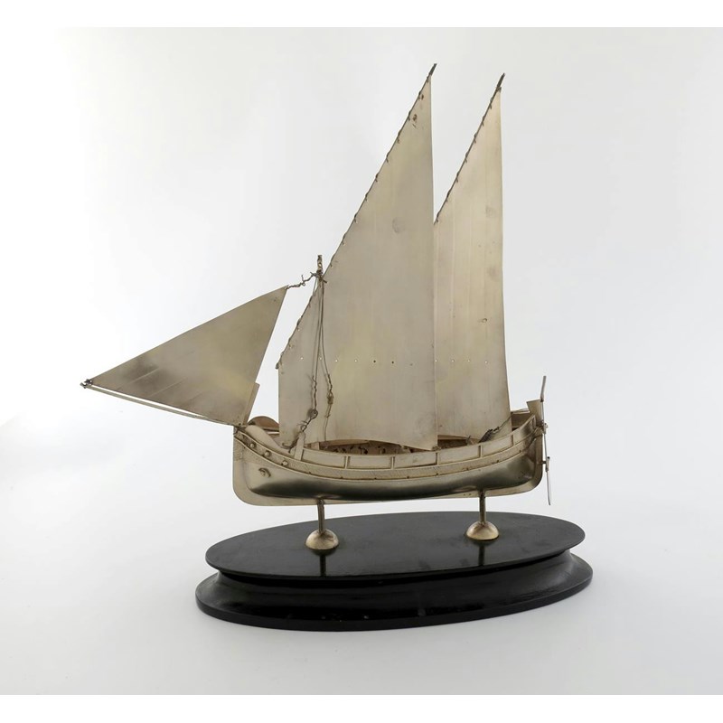 twin sails, on a raised ebonised oval plinth, height 35cm.