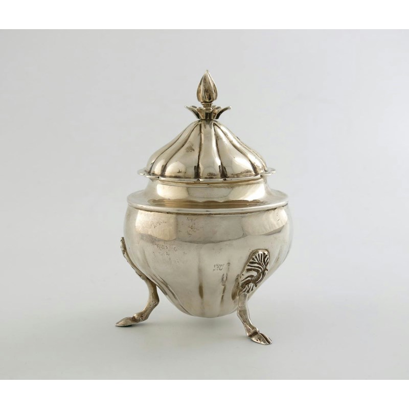 circular form, the pull-off cover with a fluted finial, on three hoof feet, height 14cm, approx. weight 7.1oz.