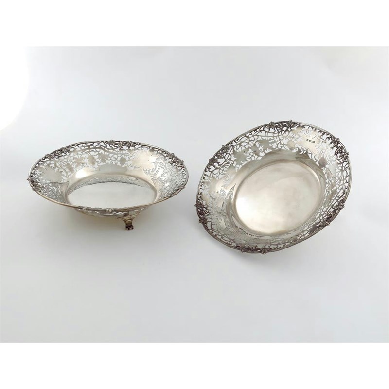 circular form, pierced with scrolling vines and with a grape and vine border, on three scroll feet, diameter 25.5cm, approx. weight 34oz. (2)