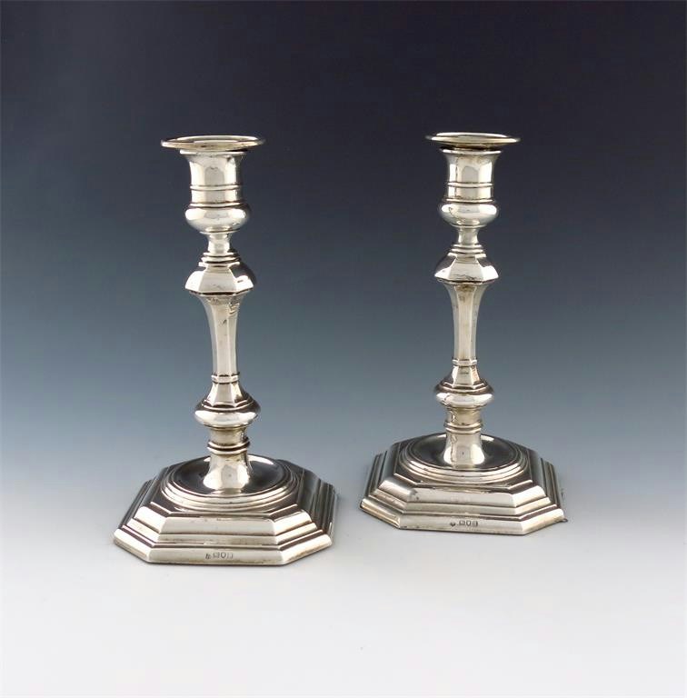 in the early 18th century manner, knopped baluster stems, removable drip pans, on raised square bases with canted corners, height 23cm. (2)