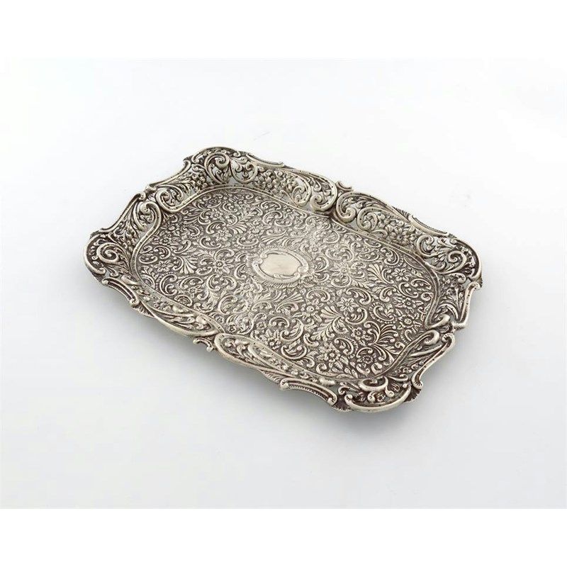 rectangular form, embossed foliate scroll decoration on a matted background, pierced foliate scroll border, length 30.5cm, approx. weight 11oz.