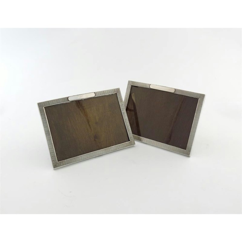 rectangular form, engine-turned decoration, the fronts applied with a plaque, silver backs and silver easel supports, length 18.3cm, approx. weight 18oz. (2)