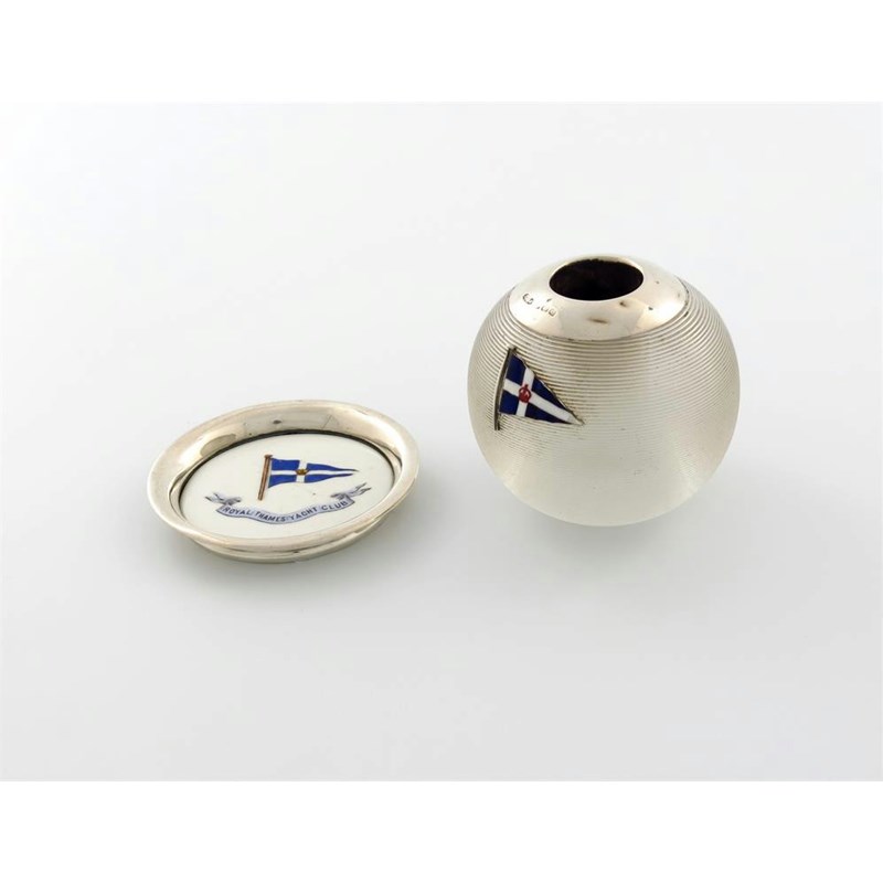 plain mount, the front applied with the enamel burgee of The Royal Thames Yacht Club, height 6cm, plus an unmarked silver-mounted ceramic pin dish, by Aynsley, the centre with the burgee of Royal Thames Yacht Club, diameter 7.2cm. (2)