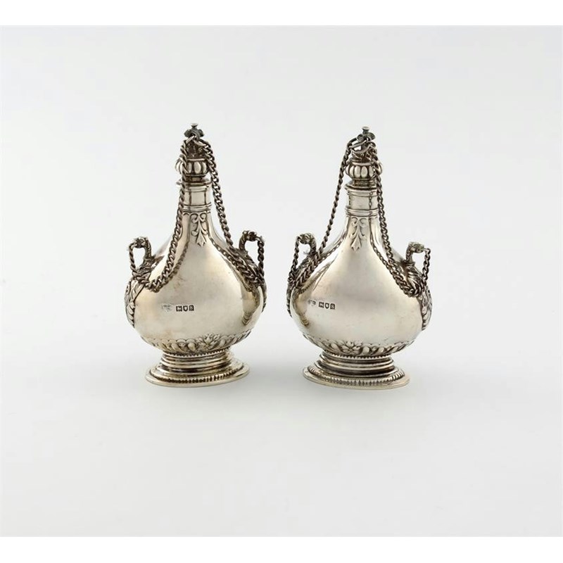 conventional oval baluster form, the pull-out stopper with two chains, on raised oval bases, height 12.5cm, approx. weight 7.3oz. (2)