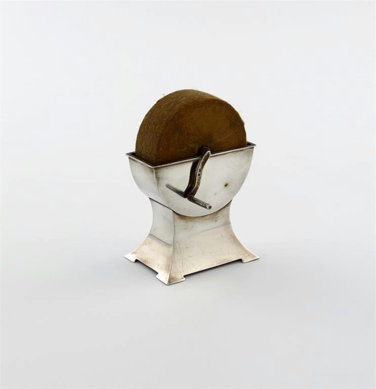 modelled as a rotating knife sharpener, with a turning handle and on a raised tapering rectangular base, height 8.5cm.