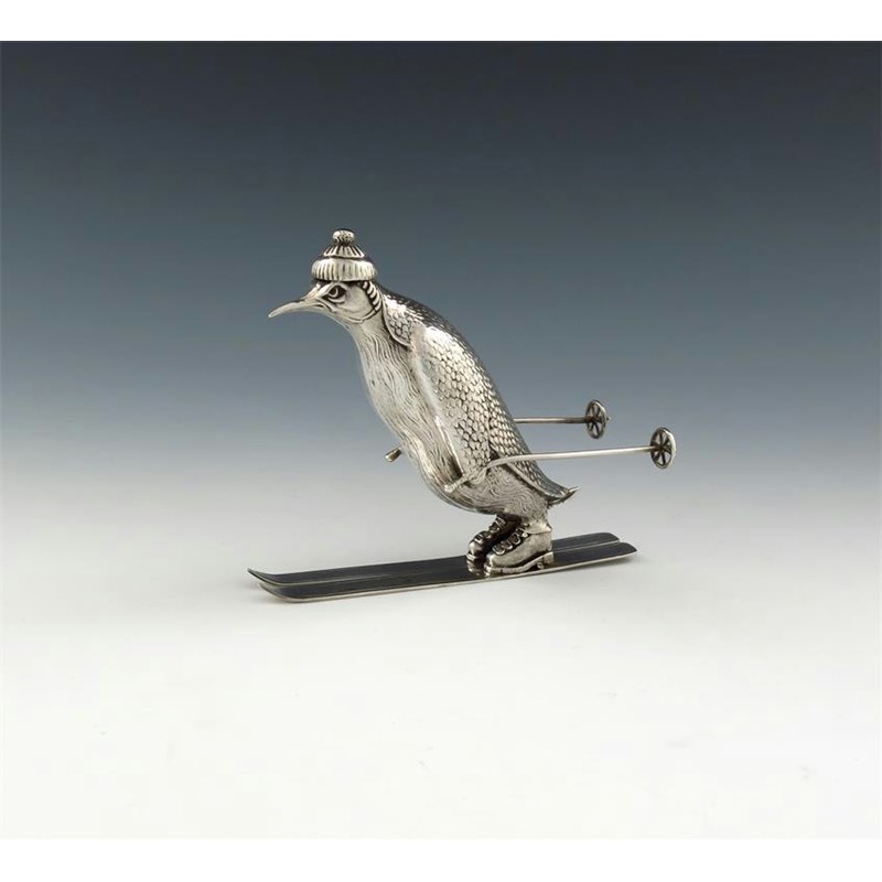 the penguin with a woolly hat and holding ski poles, height 10.8cm, approx. weight 3oz.