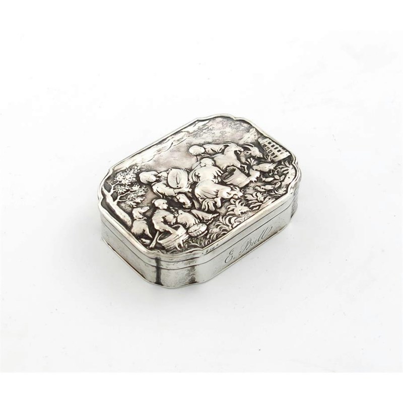 rectangular form, shaped corners, the hinged cover embossed with a farming and milking scene, the front inscribed 'E. Bull', length 7cm, approx. weight 2.7oz.