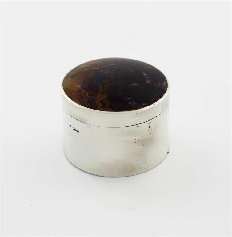 circular form, the pull-off cover set with a Blue John panel, diameter 4.4cm.