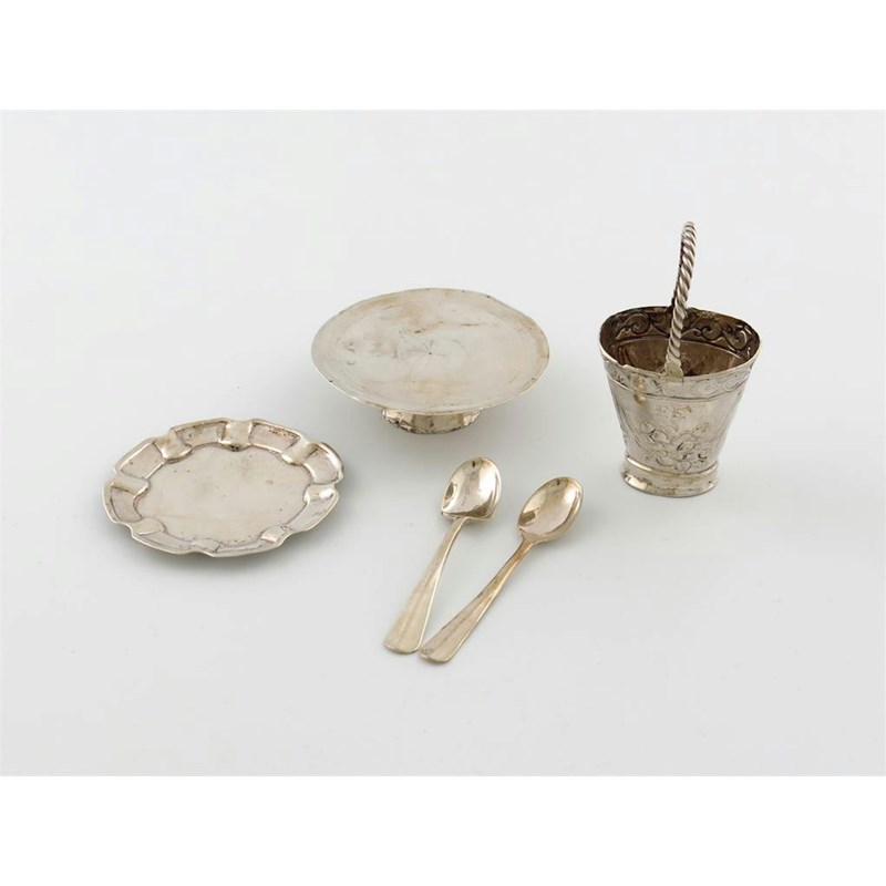 comprising: a footed salver, the underside scratch initialled 'S.L' over 'M.L', '1746', diameter 6.5cm, a shaped circular salver, the underside scratch initialled 'S.L' over 'F.L', diameter 5.7cm, two Hanoverian pattern spoons, plus a nineteenth century continental basket, of tapering oval form, embossed with flowers, approx. total weight 1.4oz. (5)