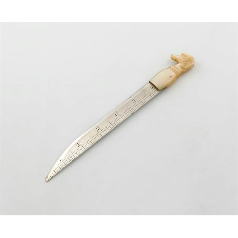 the blade with a six inch ruler, the mother-of-pearl handle carved with a dog's head, length 20.8cm.