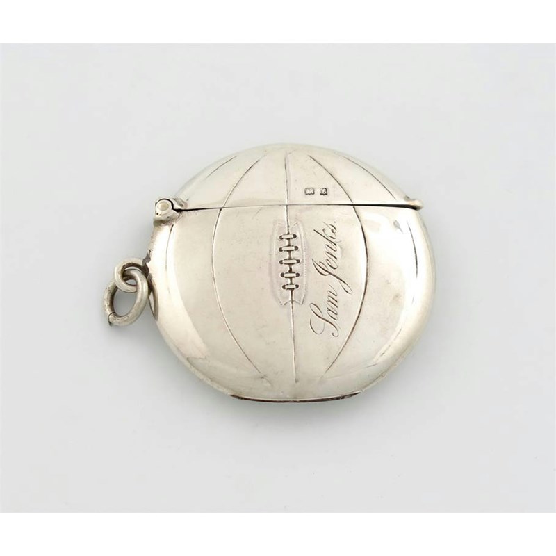 modelled as a football, engraved decoration and central lace, inscribed 'Sam Jenks', diameter 4.5cm, approx. weight 0.5oz.