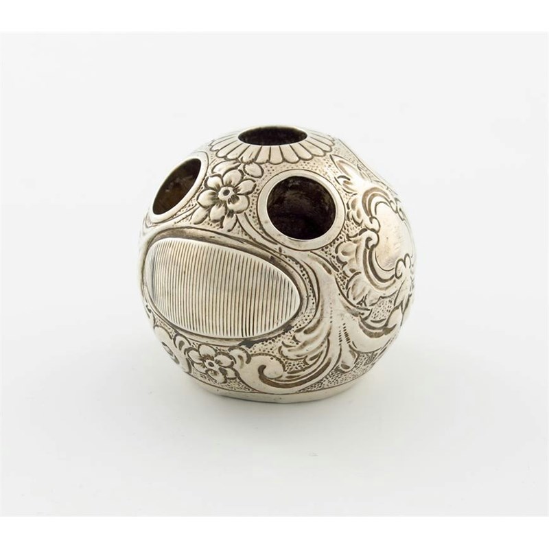 globular form, embossed foliate decoration, with five compartments for matches, and with a striker, height 5.3cm.