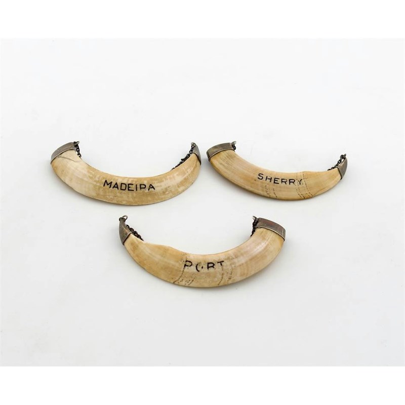 the tusks with plain mounts and inscribed in black 'SHERRY', 'PORT' and 'MADEIRA', length 12.7cm.