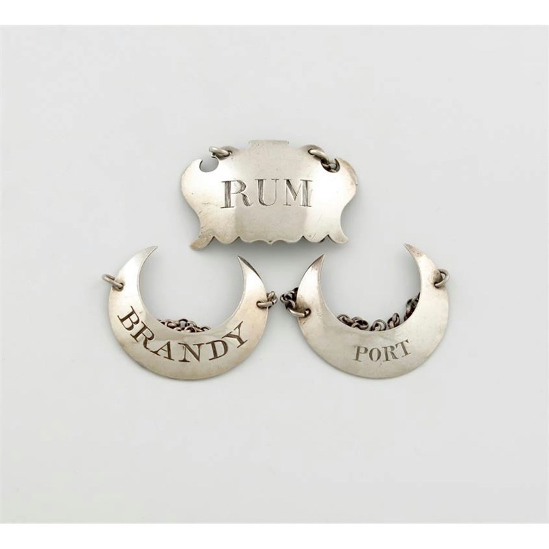 crescent form, incised 'BRANDY', length 4.3cm, another similar, by William Bateman, London 1816, incised 'PORT' and an 18th century wine label, maker's mark of John Le Sage with a pellet above, incised 'RUM', length 4.8cm, approx. total weight 1oz. (3)