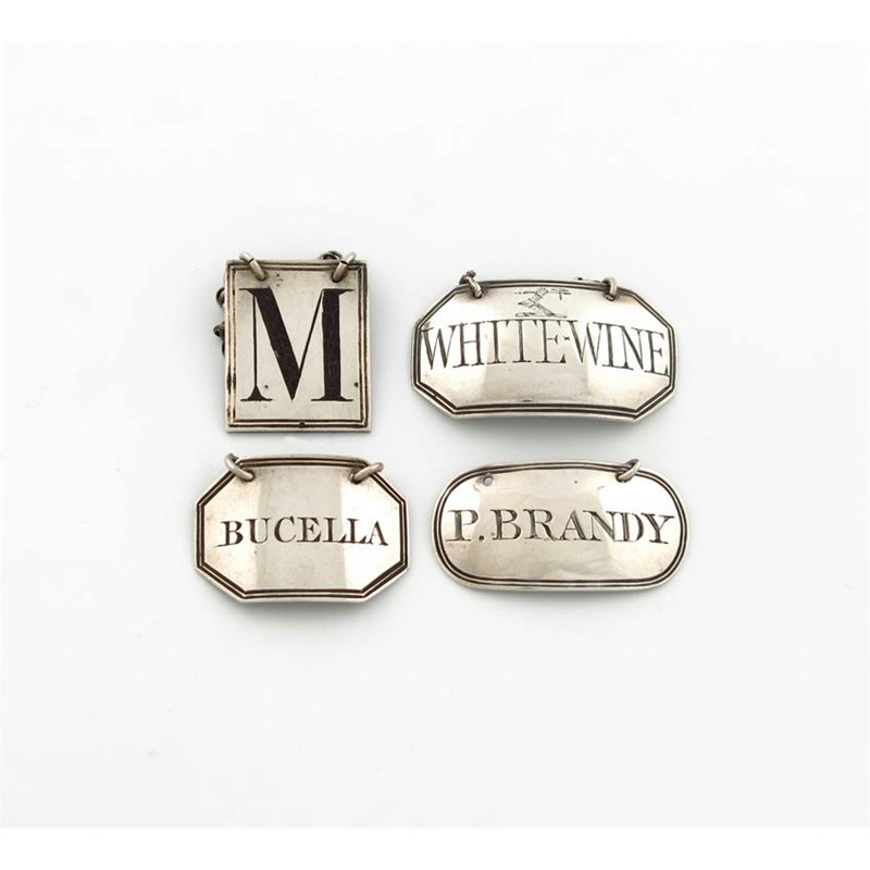 comprising: a Victorian label, by Henry Holland, London 1857, oblong form, reeded border, incised 'P. BRANDY', plus George III label, by John Rich, London 1795, incised 'WHITE WINE', with a crest above, and a label 'BUCELLA' and one of rectangular form, incised and blackened 'M', approx. total weight 1.1oz. (4)