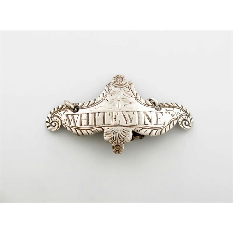 shaped scroll form, feather-edge border, incised 'WHITE WINE', length 5.3cm, approx. weight 0.2oz.