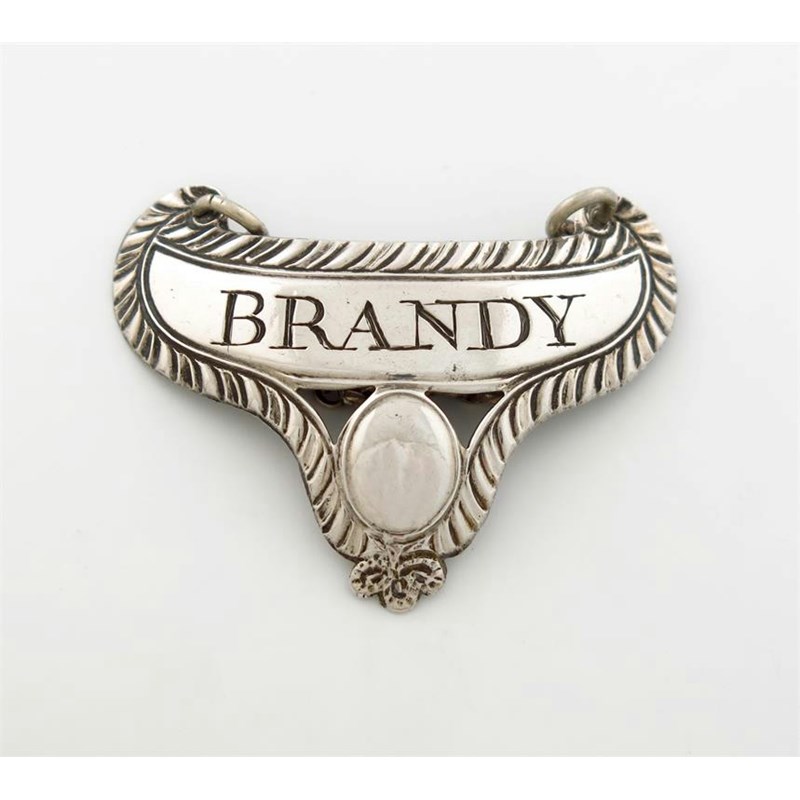 scroll form, feather-edge border, with an oval vacant cartouche, incised 'BRANDY', length 5.1cm, approx. weight 0.3oz.