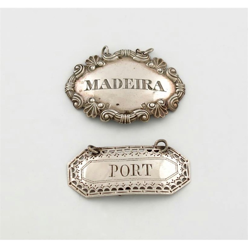 rectangular form, canted corners, pierced and bright-cut border, incised 'PORT', length 5.4cm, plus an early 19th century Irish wine label, by John Tearle, Dublin circa 1820, shaped oval form, fluted scroll an shell border, incised 'MADEIRA', length 5.5cm, approx. total weight 0.5oz. (2)