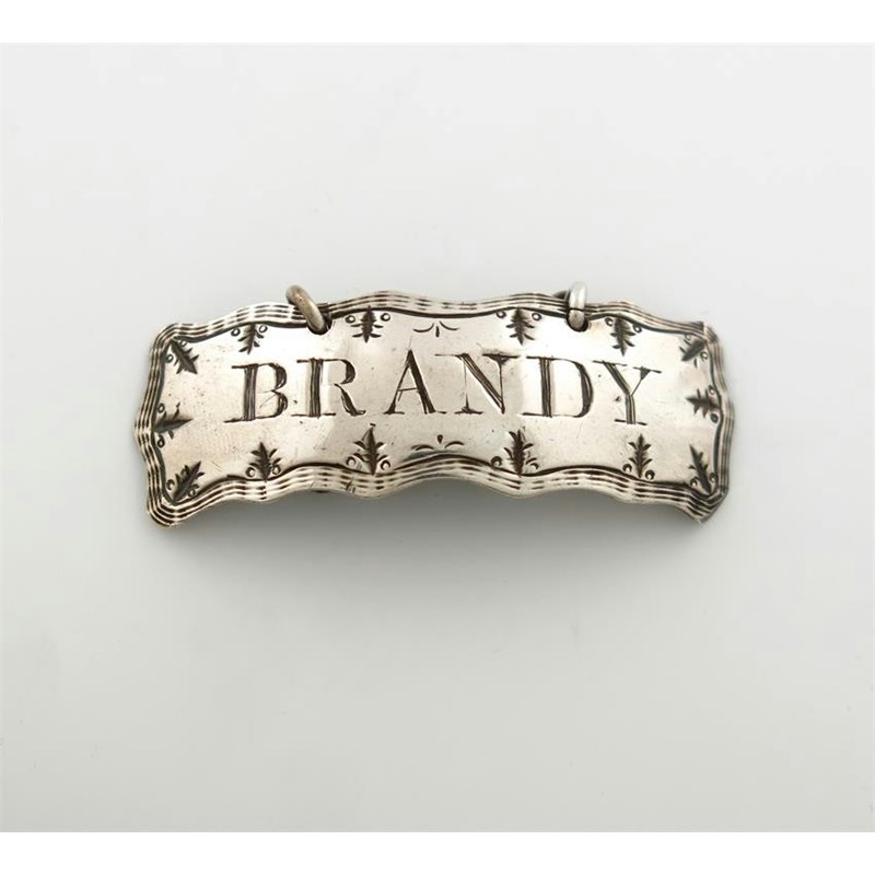 shaped rectangular form, stylised thistle border, incised 'BRANDY', length 5.5cm, approx. weight 0.4oz.