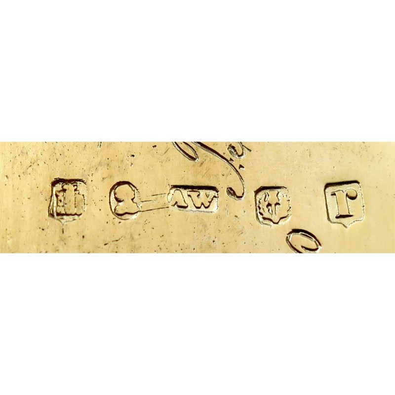 plain rectangular form, with a foliate thumb-piece, the silver-gilt interior, with later initials and date, length 6.8cm, approx. weight 2.2oz.