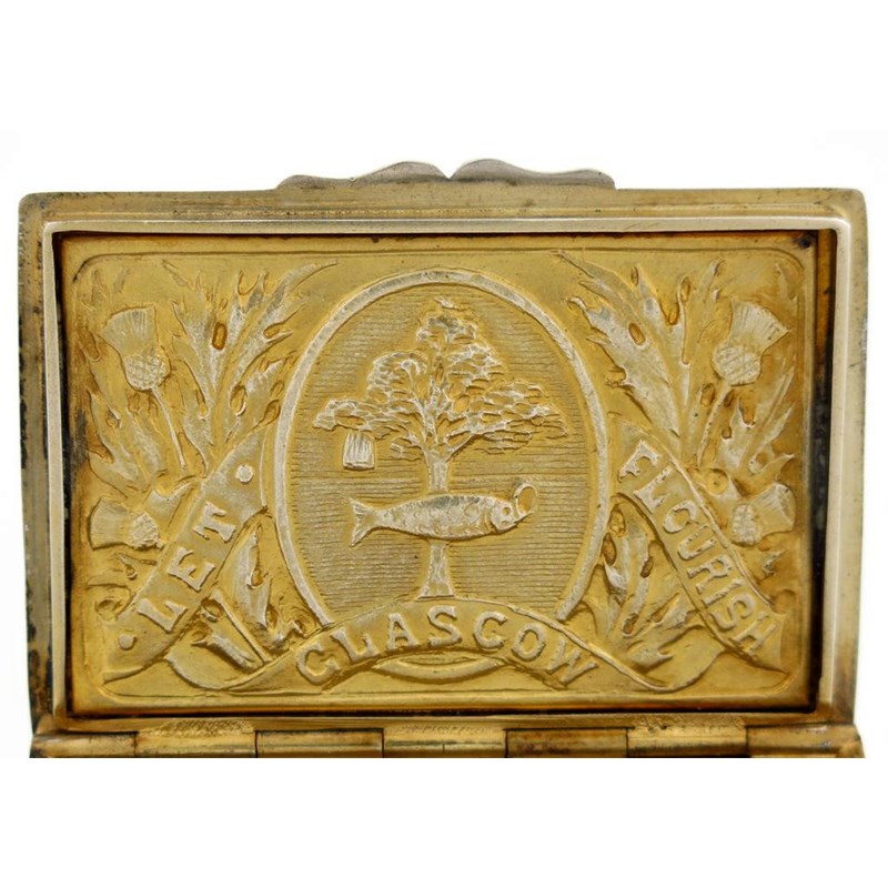 rectangular form, the hinged cover with a scene of the exhibition pavilion, the silver-gilt interior with the arms of Glasgow and 'Let Glasgow Flourish', length 5cm, approx. weight 1.3oz.