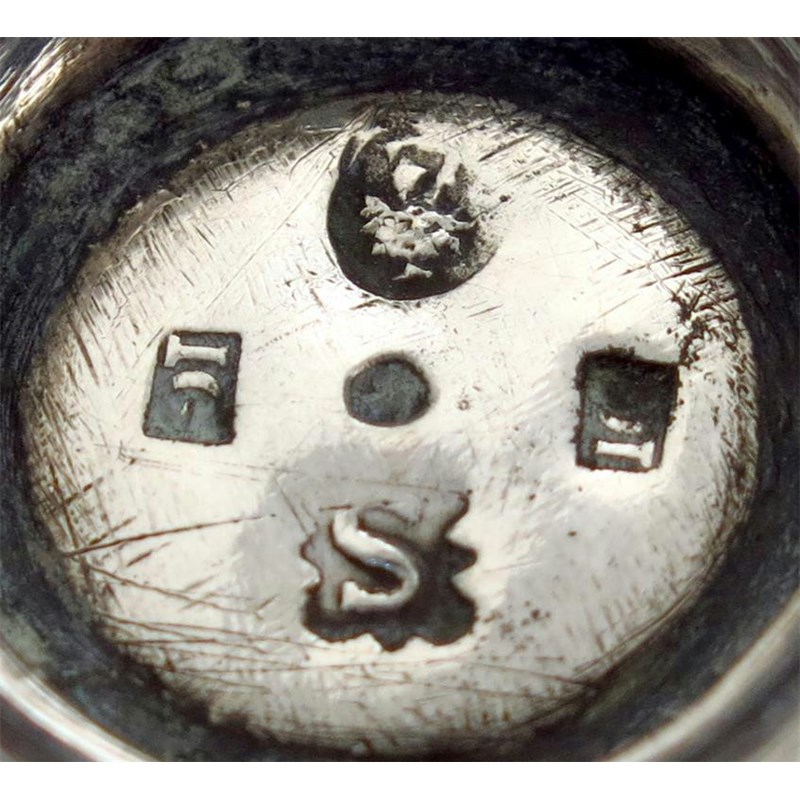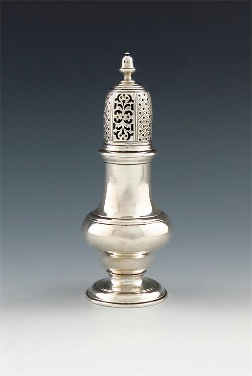 baluster form, the pull-off cover with pierced decoration and with an acorn shaped finial, on a raised circular foot, height 15.5cm, approx. weight 6oz.