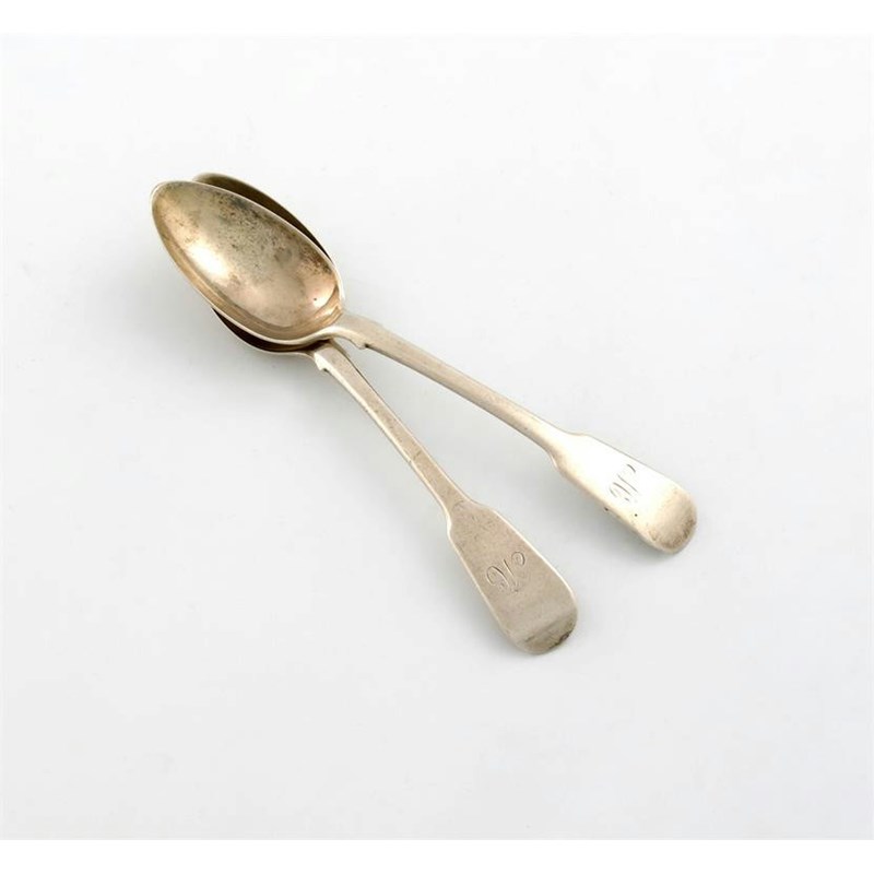 A pair of early 19th century Scottish provincial silver Fiddle pattern dessert spoons