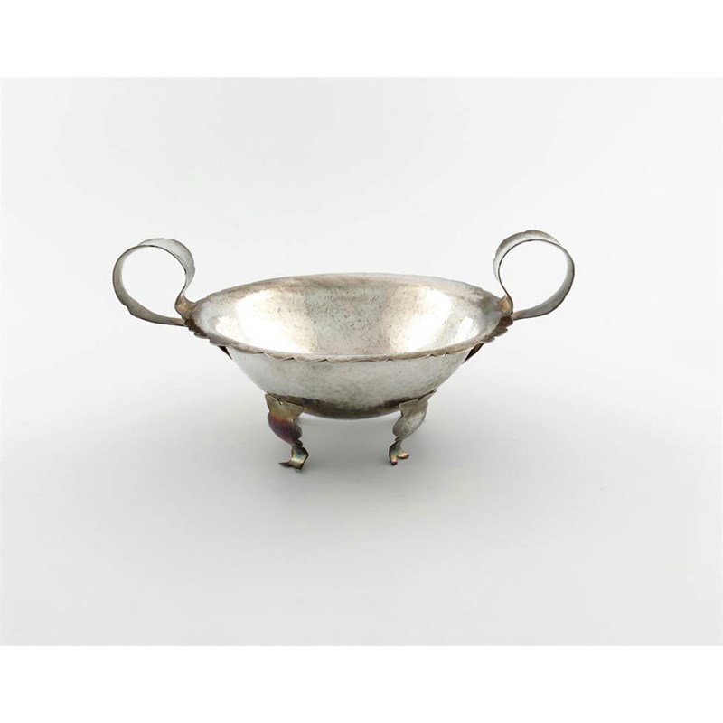 circular form, wavy-edge border, spot-hammered decoration, scroll handles, on four legs, diameter handle to handle 23.8cm, approx. weight 11oz.
