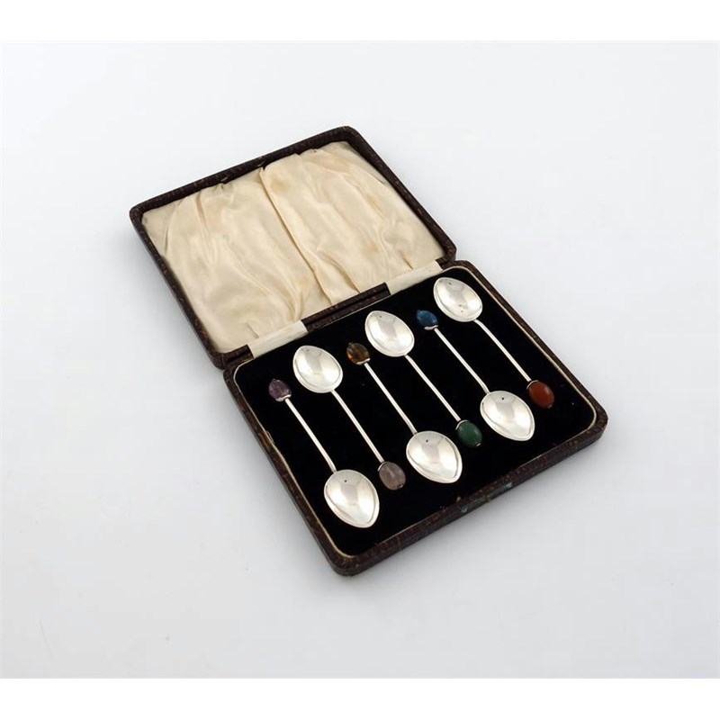 each with a different hard stone finial, in a fitted case, approx. weight 1.3oz.