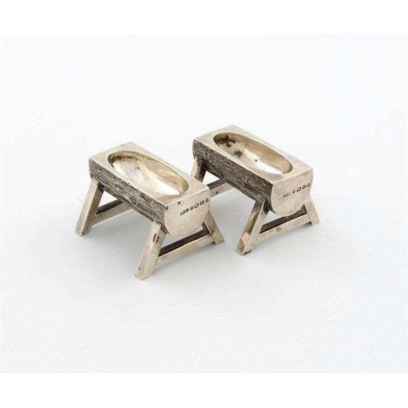 modelled as troughs, simulated tree trunk decoration, on four tapering legs with a cross bar, length 4.8cm, approx. weight 1.9oz. (2)