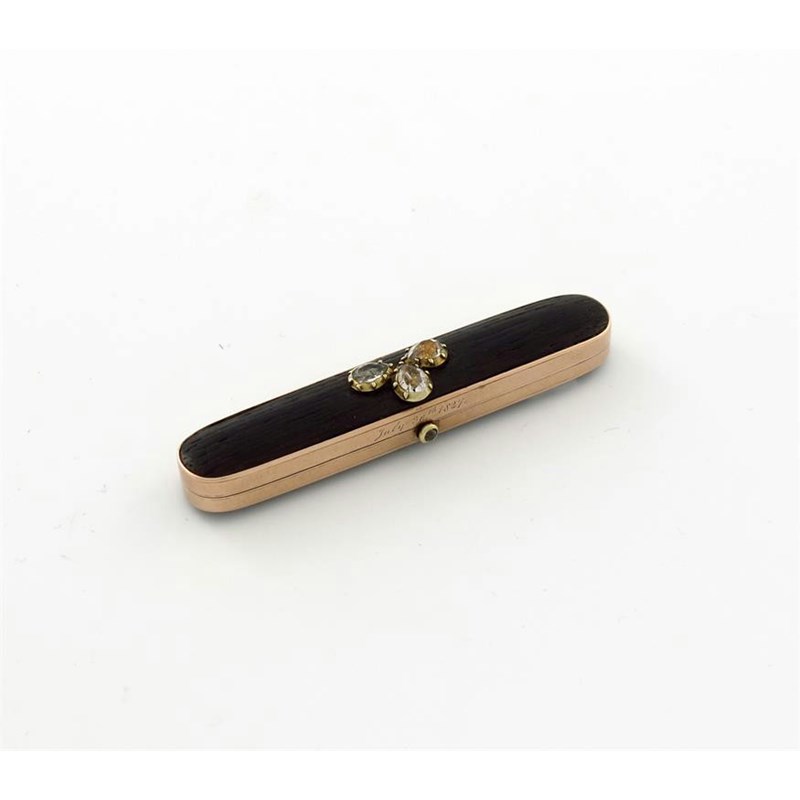 rounded rectangular form, the hinged cover mounted with three paste cabochons to form a shamrock, the side engraved 'July 30 1827', length 7.2cm.