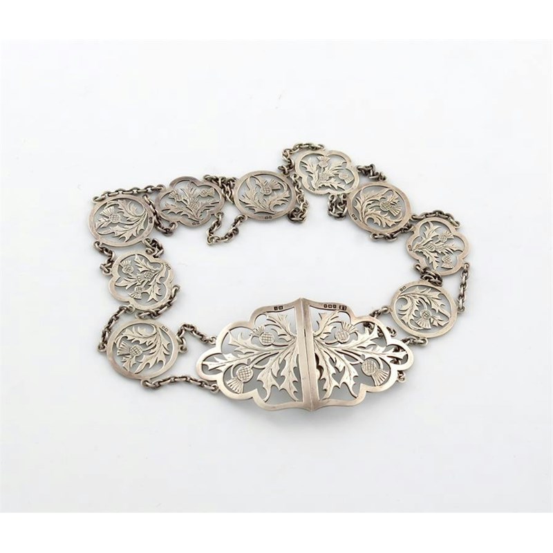 with nine circular and lobed oval sections pierced and engraved with thistles, connected by chains, and with a central two-section clasp pierced and engraved with thistles, total length 63.5cm, approx. weight 3.3oz.