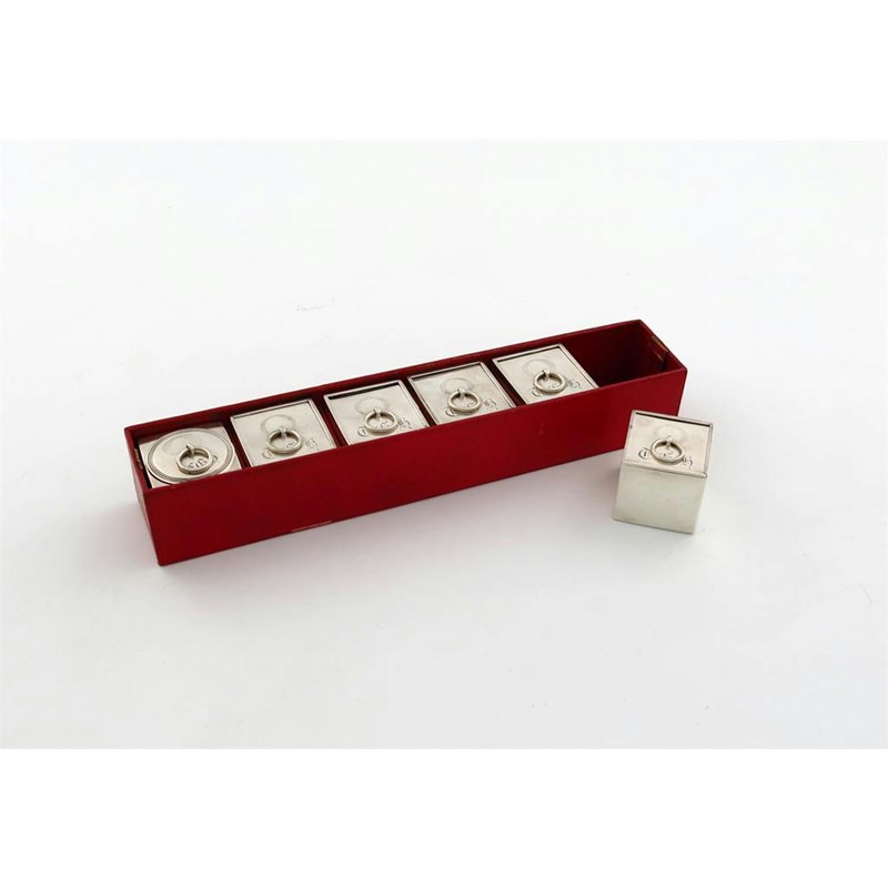 square form, five with slide-off covers with a plain ring finial, one with a pull-off circular cover with a reed border and ring finial, all engraved with initials, in a fitted red Morocco leather-bound tray, height 3.2cm, approx. weight 8.5oz. (6)