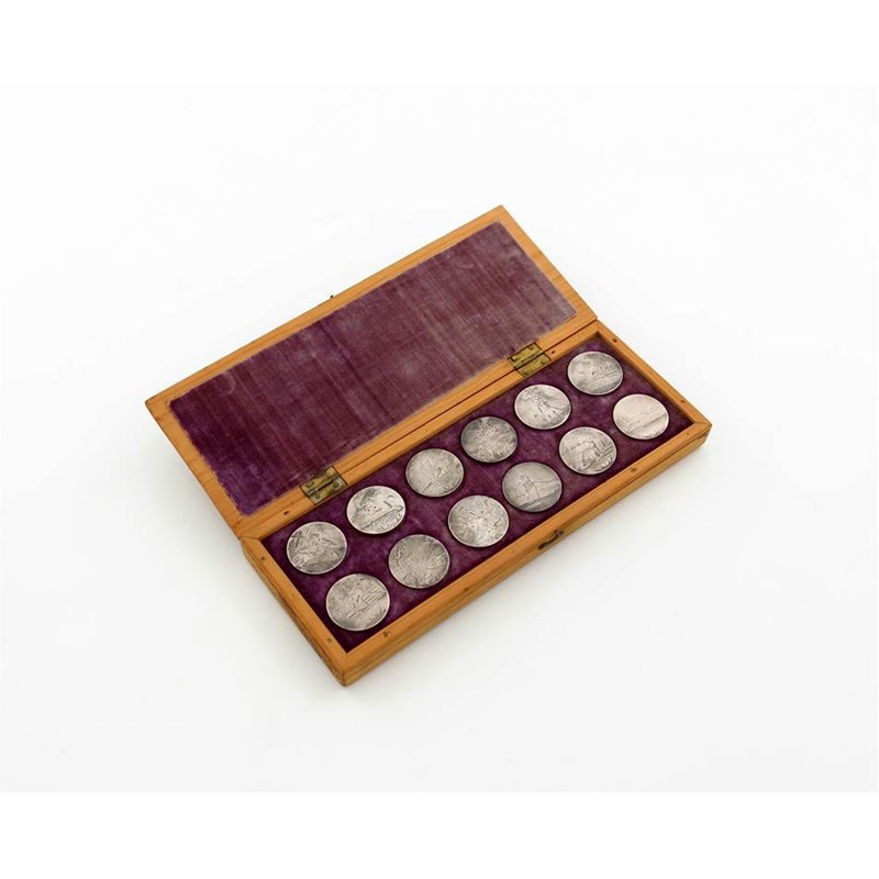 circular form, engraved with various hunting and shooting scenes, with game birds and animals, in a velvet lined wooden case, diameter 2.7cm, approx. weight 2.4oz.