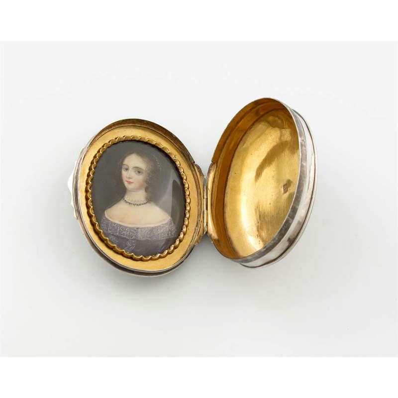 oval form, the hinged cover embossed with birds within foliate scroll decoration, plain thumb-piece, the gilded interior set with an oval panel of a lady in a purple dress, length 8.3cm, approx. weight 2.5oz.