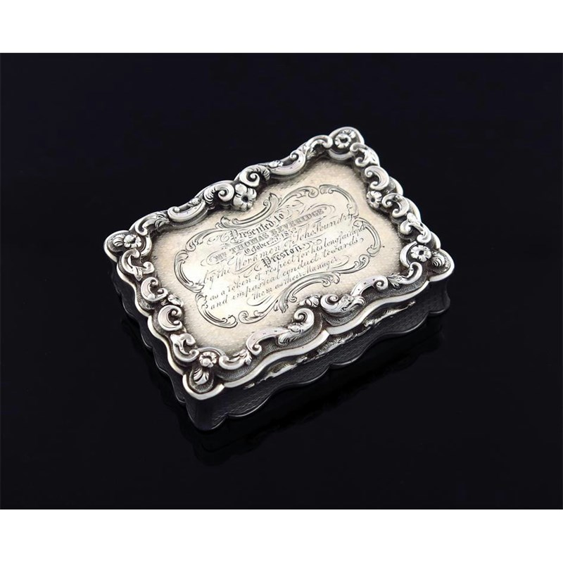 rectangular form, engine-turned decoration, the hinged cover with a raised wavy-edge scroll border, and inscribed, ' Presented to Mr Thomas Beveridge, October 23 1852, by the Workmen of Soho Foundry, Preston, as a token of respect for his long faithful and impartial conduct towards them as their manager', length 9cm, approx. weight 6.1oz.