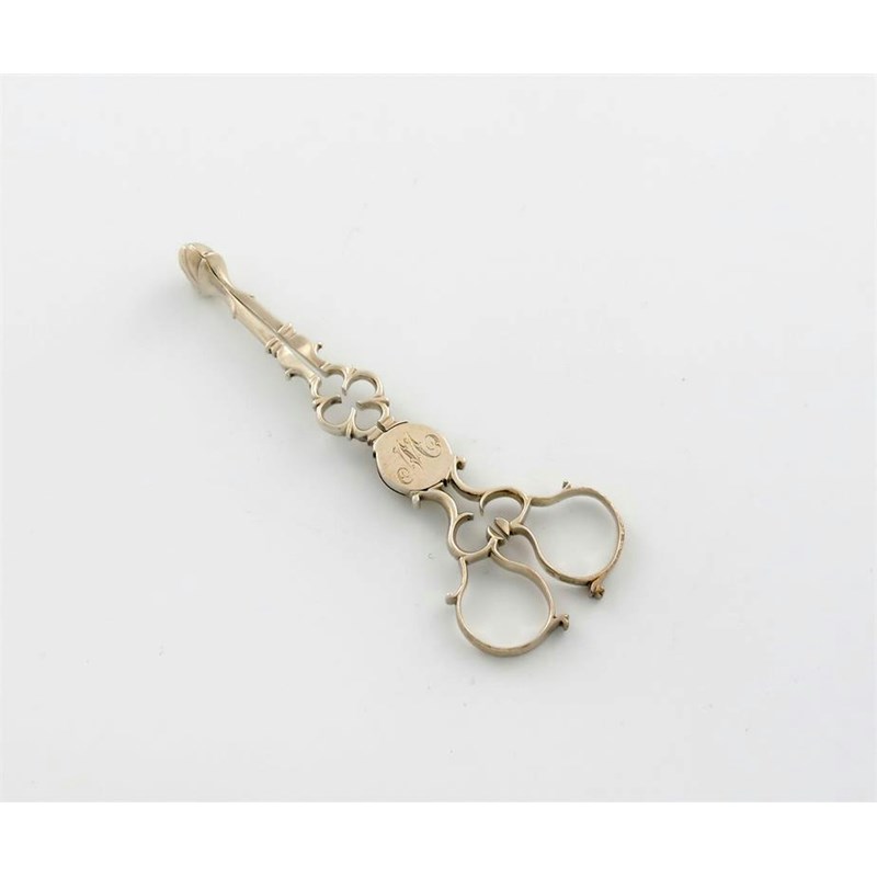 scroll handles, and scroll arms, with shell bowls, the close nips for a quatrefoil motif, initialled, length 12cm, approx. weight 1oz.