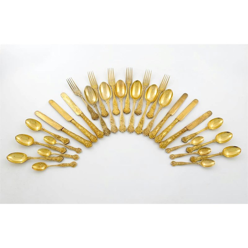comprising: six dessert forks, six dessert spoons, six dessert knives, six coffee spoons and six teaspoons, the terminals with a crest, approx. weight 19.5oz. (24)
