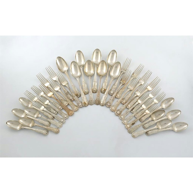 he terminals with a crest, comprising: twelve table forks, ten dessert spoons, six dessert forks, nine dessert forks, and six tablespoons, plus two later tablespoons, Sheffield 1925, approx. weight 100oz. (qty)