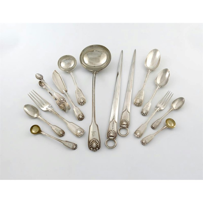 A part canteen of George IV silver Fiddle, Thread and Shell pattern flatware,