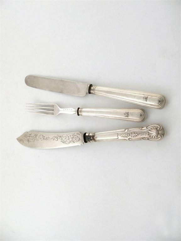 A set of nine Victorian silver King's pattern fish knives, the blades with engraved decoration, the terminals crested, by Francis Higgins, London 1866 and 1868, together with nine Victorian silver handled Reeded pattern dessert knives and forks, with close plated blades, engraved with a crest. (27)